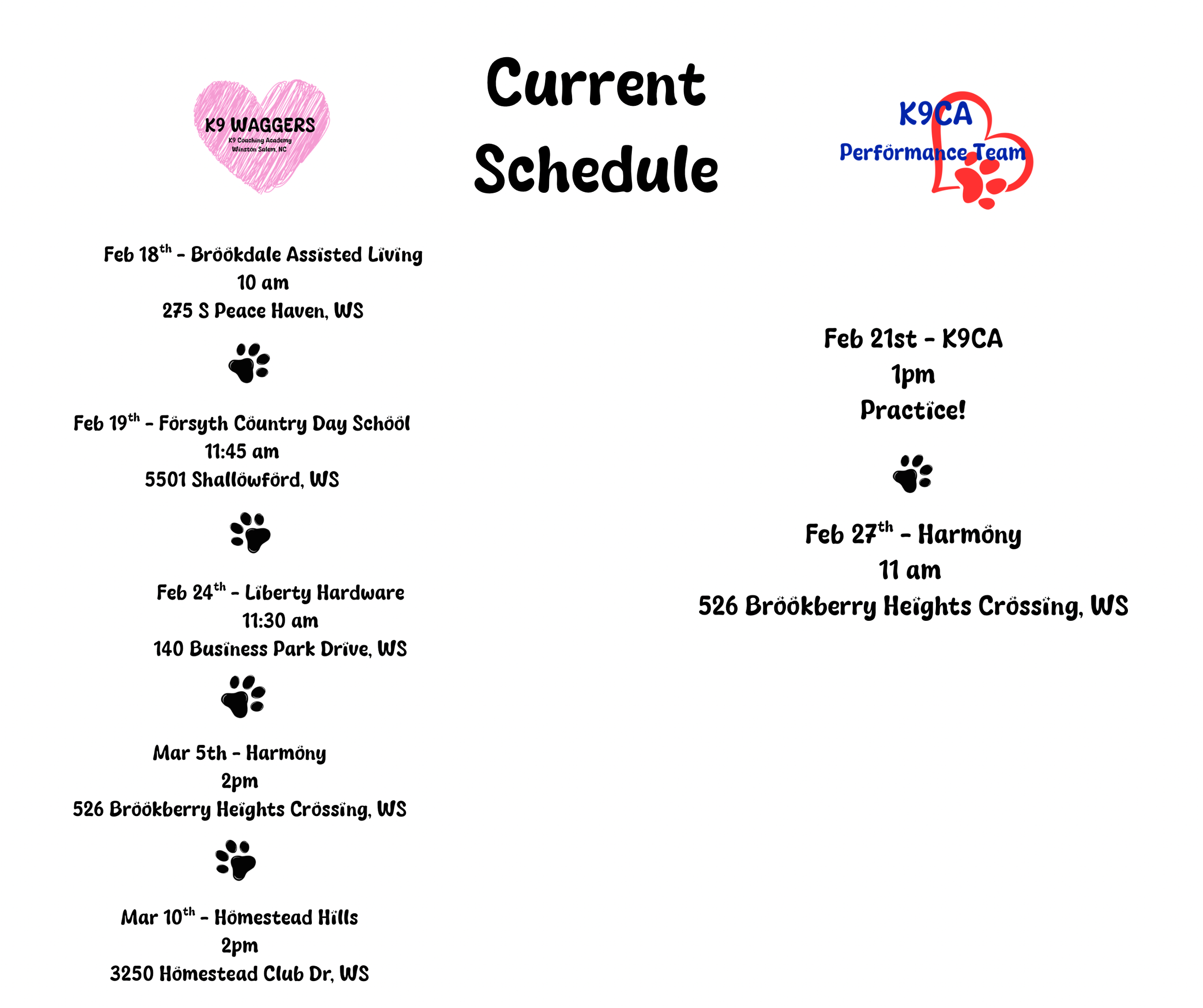 K9 Waggers & Performance Team Schedule
